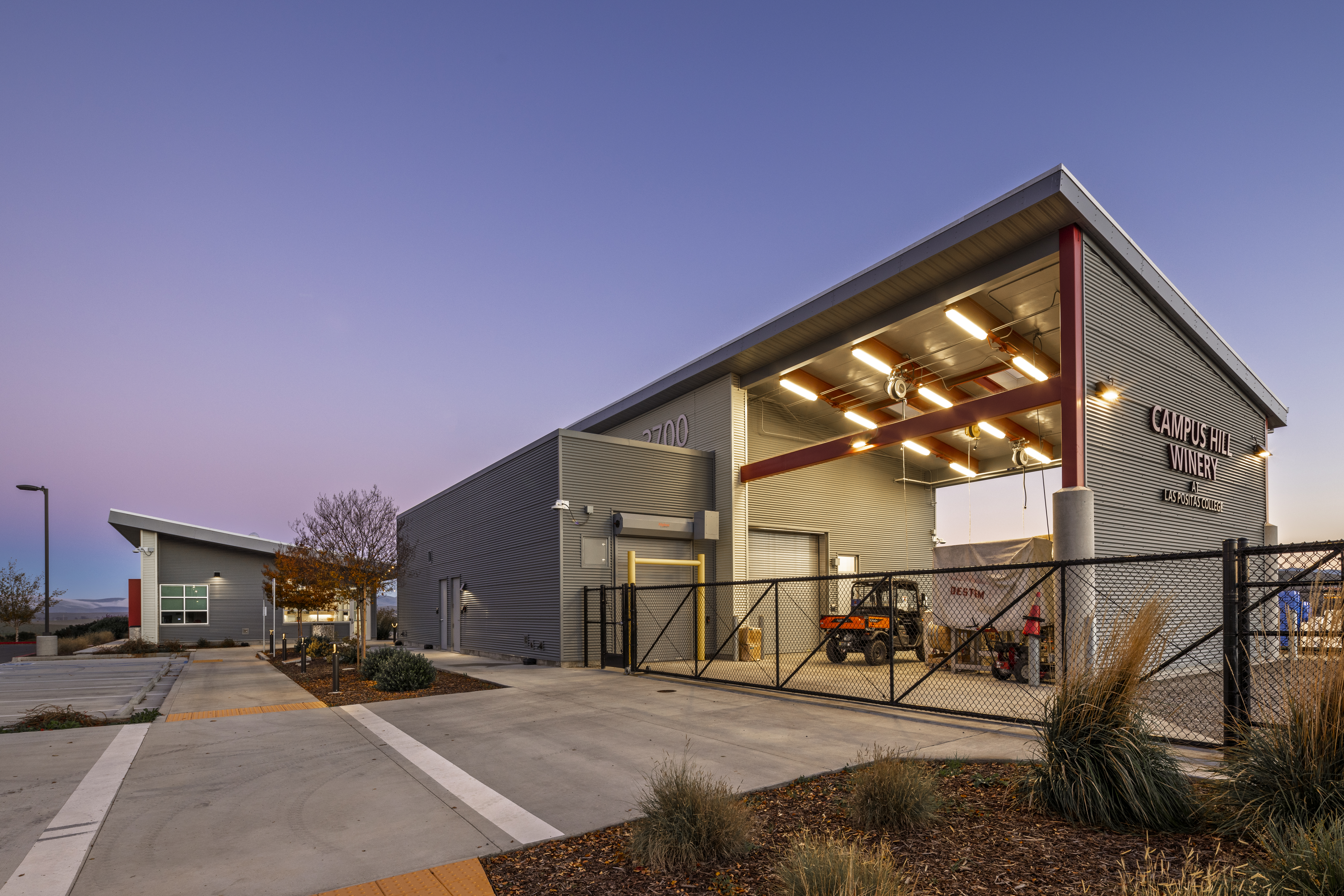 The new LEED SILVER Viticulture facility is comprised of instructional areas, hospitality areas, faculty offices, outdoor patio, wine production rooms and storage areas. Connecting the facility to the campus and vineyards requires pedestrian, car, truck and farm equipment access. Specifically, the program is split between two single story buildings; a dedicated Winemaking Building and a Classroom Building.