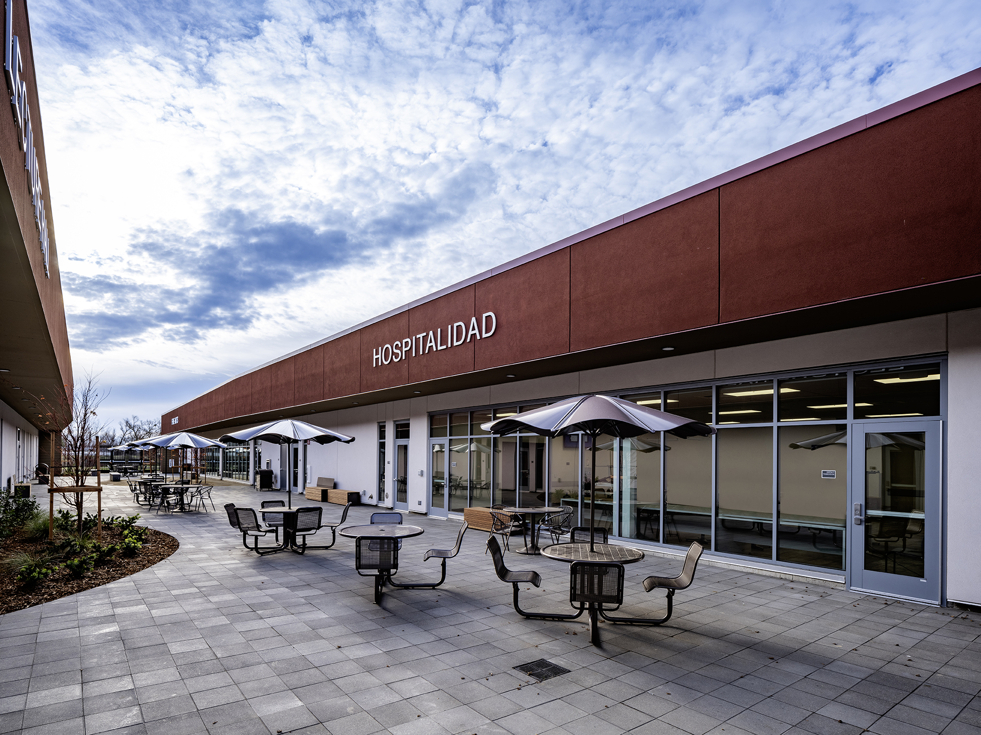 The program consists of a flexible theater that accommodates 400 seats with back of house spaces, Music labs, Fine Arts labs, Culinary Arts labs and flexible classrooms to accommodate many types of instruction. The design arranges the programmatic elements into a welcoming curvilinear form that surrounds a new main activity quad to invite visitors and students to relax or explore various career options. A unique feature will be an outdoor dining area which will be utilized by the Hospitality program where students will serve patrons food that is grown on site to promote their “farm to table” health and wellness philosophy.